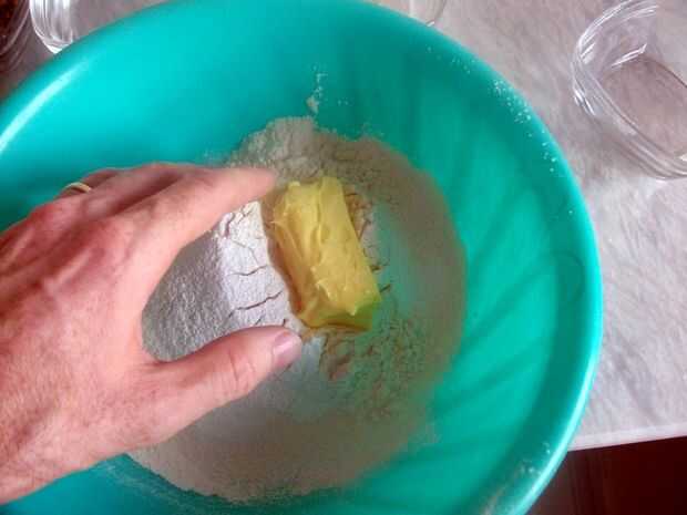 Frote la mantequilla en la harina hasta que se asemeja a pan rallado.