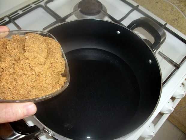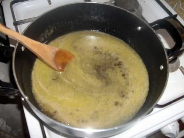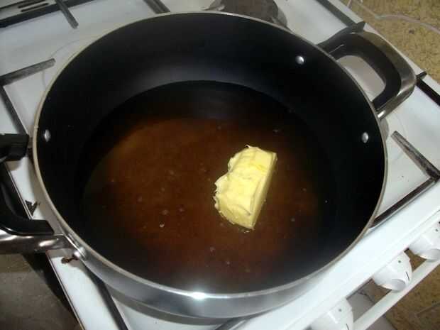 Combinar agua, azúcar morena y mantequilla en una olla de fondo pesada. Si eres un fan de jarabe de caramelo, entonces aquí es donde puedes ser generosos con las cantidades. Calentar suavemente y remover hasta que comience a hervir.