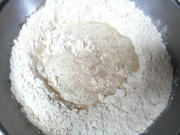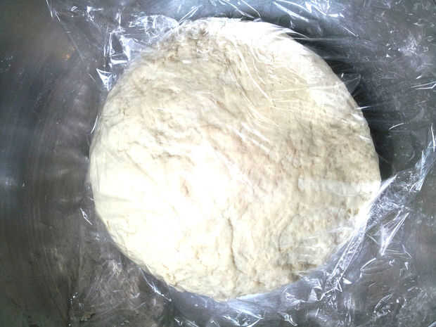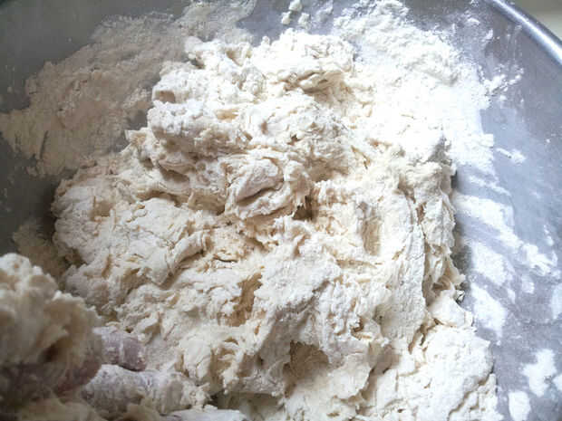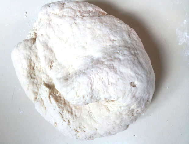 Cada marca de harina absorbe el agua un poco diferente. La harina debe pesar alrededor de 10 oz y sentir la masa, puede que necesite ajustar un poco la cantidad de agua. En una ensaladera, añada agua de la harina y mezclar hasta que la masa sólo se sujetan. Amasar la masa sobre una superficie enharinada durante 3-5 minutos hasta que esté suave. Cubrir con papel plástico y deje reposar durante 30 minutos al menos.