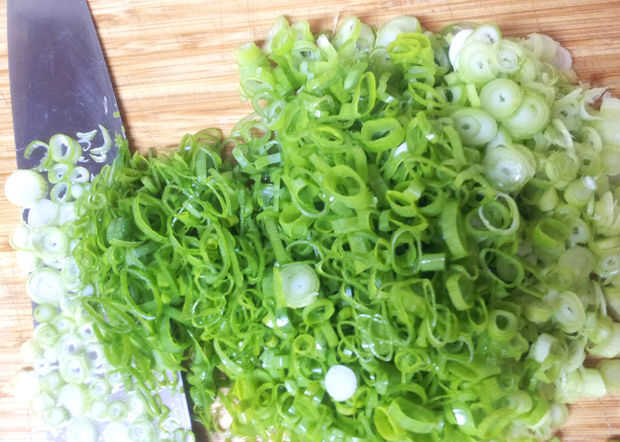Divide la cebolla de verdeo y el jengibre en 2 porciones iguales.