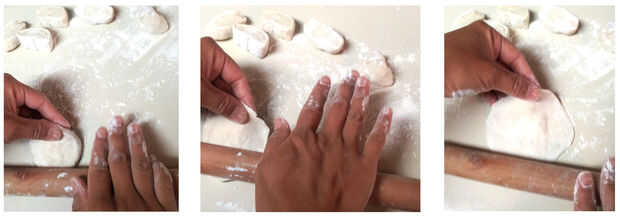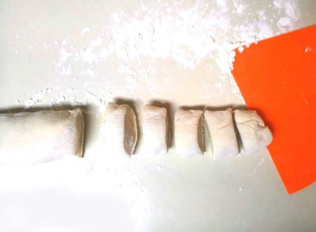 Tenga a mano para cubrir la masa y envolturas sequen algunas envolturas de plástico y enharinar ligeramente para que no se pegue. Comenzar con 1/2 libra de masa, rodillo en 12" de largo y 1" registro de ancho, cortar en trozos de 12-15. Prensa para aplanar cada pieza.