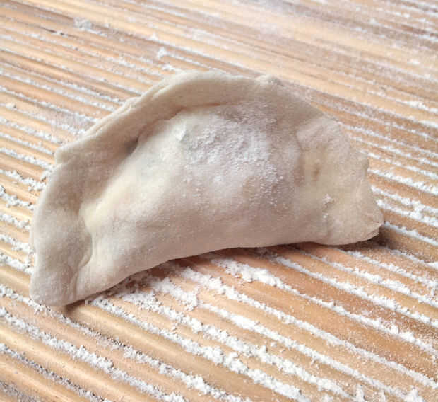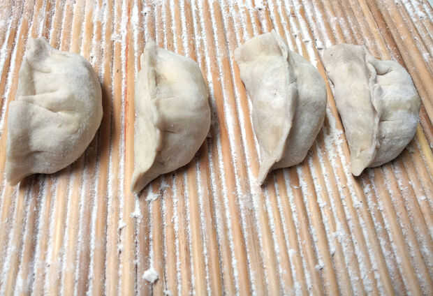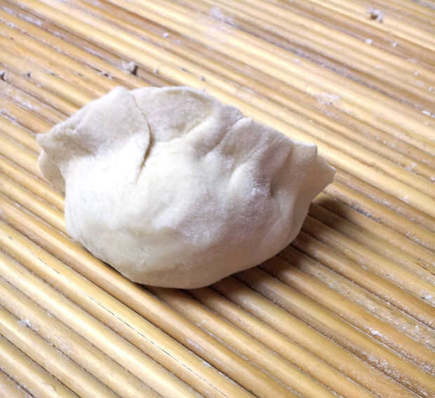 Los 3 primeros pellizcos son la clave. Si nos fijamos en el envoltorio redondo como un reloj, después de colocar un relleno en el centro, el primer sujetador se une a los puntos de 12:00 y 6:00. El siguiente 2 pizcas no se hacen en los puntos de la mitad - 3:00 y 9:00! Se forma el segundo pellizco en 2:00 y tercer pinch es 10:00. El lado con masa extra doblado pliegues y sellado por el borde con sin pliegues.