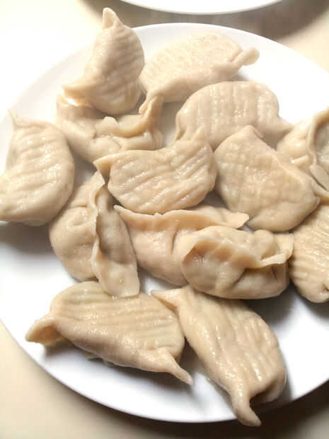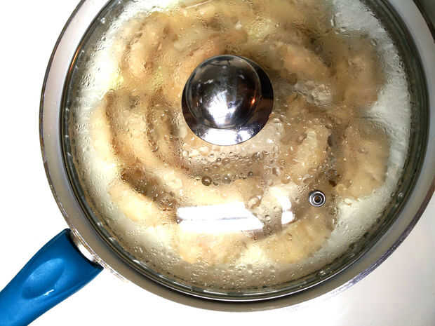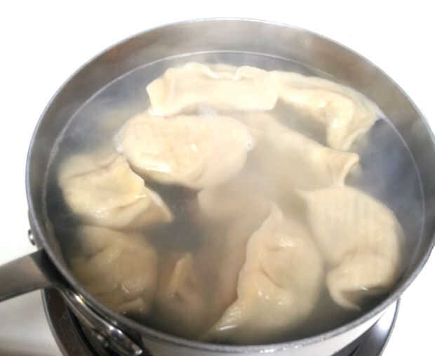 Para hervir las bolas de masa hervida, poner una olla grande de agua - unos 3 cuartos de galón, a hervir rápido, deje caer la bola de masa hervida ligeramente en el bote, mantener las altas temperaturas, Revuelva suavemente para la bola de masa hervida no se pegue a la olla y espere hasta que el agua vuelva a hervir. Ahora Vierta una taza de agua fría (0,5 taza si está usando un bote más pequeño con menos agua) en la olla y déjalo volver a hervir otra vez. Esto da más tiempo para el relleno al vapor en el interior, mientras que no sobre cocinar la envoltura. Repita este paso una vez más y cuando los ñoquis flotan hacia la superficie, y han pasado 5 a 7 minutos, sacarlos en un colador y transferencia a un plato.