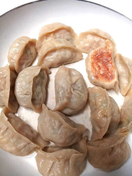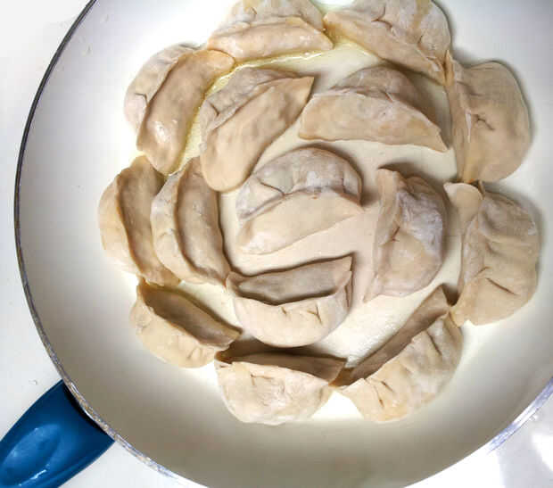 Para freír las albóndigas, coloque una sartén antiadherente sobre fuego medio alto, agregar 2 cucharadas de aceite y agitar. Coloque las bolas de masa hervida en, tratar de que no les tocan. después de 1 ó 2 minutos, se escuchará un sonido de chisporroteo a partir a suceder, agregar 1/2 taza a 2/3 de taza de agua y cubra la tapa. Baje el fuego a medio y deje que las bolas de masa hervida al vapor durante unos 5 minutos. Ya se habrá evaporado el agua. Retire la tapa, compruebe si la parte inferior de las bolas de masa hervida ha formado una bonita costra dorada. Si no, deje que se cocine destapado un poco más.