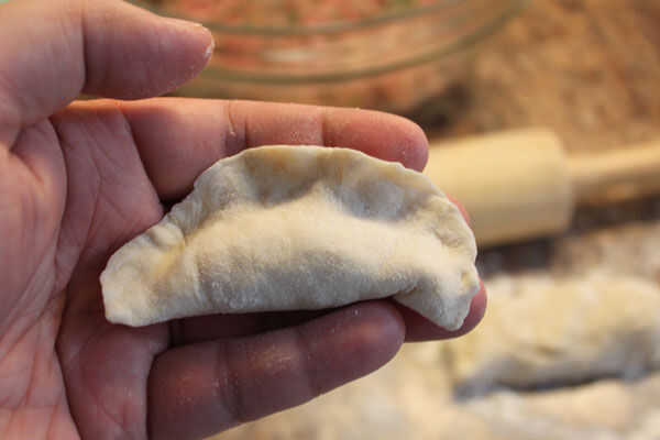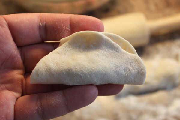 3.) usando las puntas de sus dedos pulgar e índice, pellizcar la piel de un lado a otro, éstos forman pliegues en la bola de masa hervida.