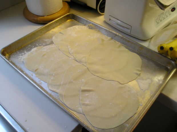 Rodillo de los pisos en fina pulgadas ocho rondas. Pone, con un montón de harina entre ellos, en una placa o bandeja.