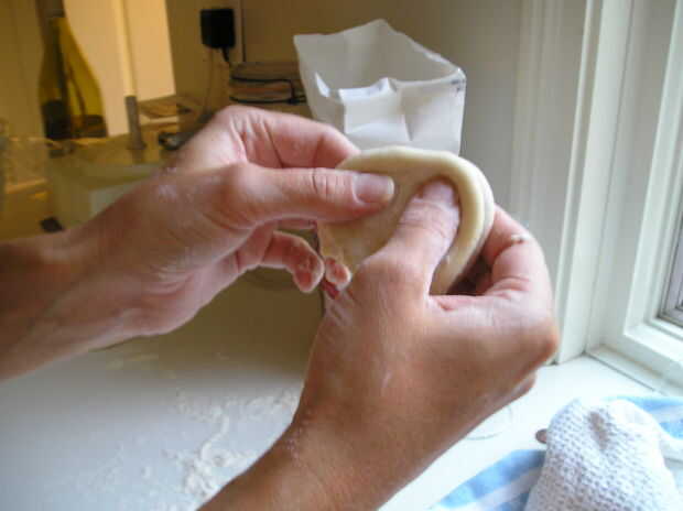 Con abundante harina, poner dos rondas de masa junto y presione con el pulgar y los dedos de puntero en pisos de cuatro pulgadas de diámetro.
