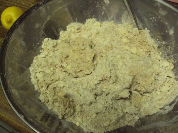 Rompa el huevo en una taza de medir, batirlo con un tenedor y añadir el vinagre. Llenar con agua hasta que alcanza una taza. Vierta en la mezcla de harina un poco a la vez y revuelva y mezcle con un tenedor hasta que todo el líquido se dibuja en. Con las manos, mezcle la mezcla y amásela hasta que las migas en su mayoría han desaparecido. Combinar todo en una bola y luego dividirla en cuatro bolas más pequeñas. Las bolas de masa hervida, mantener 1-2 bolas. Los demás envolver en bolsas de plástico y almacenar en el congelador para futuras recetas.