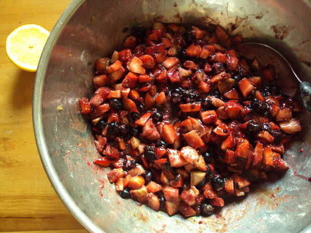 Si usa bayas congeladas, descongelar en el microondas primero y drenar la mayor parte del líquido (guardar esto para más adelante para mojar la salsa si quieres). En un tazón grande mezcle el azúcar, la harina y la mezcla de bayas y dejar reposar durante 10 minutos. Añadir el jugo de limón. Si encuentras la mezcla muy acuosa, añadir dos cucharadas más de harina.