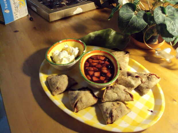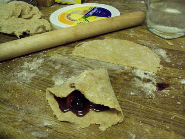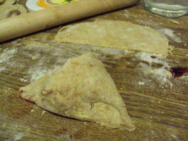 No es demasiado difícil una vez que el cuelgue de ella. Extienda la corteza hasta que quede aproximadamente 1/8 de pulgada de grosor. Cortar círculos de 6-8 pulgadas de diámetro. Puede ser extraídas con las tapas de margarina o mantequilla. Cortar cada círculo por la mitad y colocar una cucharada de relleno, ligeramente más grande que lo haría con las bolas de masa hervida. Doblar dos lados de la masa sobre el relleno (ver imagen) y juntos. Doble la parte inferior y presionar sobre los pliegues anteriores para formar un triángulo.