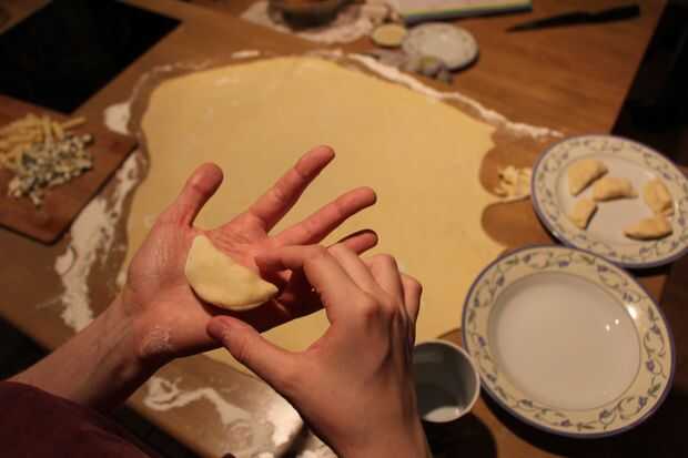 Deja el lado que tiene más harina en el exterior. Moje el borde de la masa ligeramente con agua. Esto lo ayudará a pegar mejor juntos. Presione suavemente la bola de masa hervida en forma de media luna con los dedos.