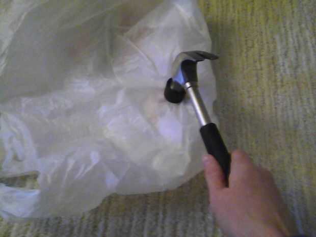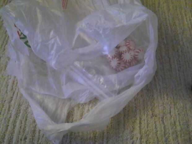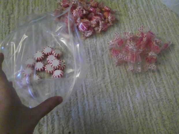 Desenvolver las hierbabuenas y ponerlos en un resellables ziploc bolso.  Ponga el bolso en otra bolsa de plástico y me fui a las casas de moneda con un martillo.  Después de que fueron aplastados, puso en mi mini procesador de alimentos para pulverizar aún más.