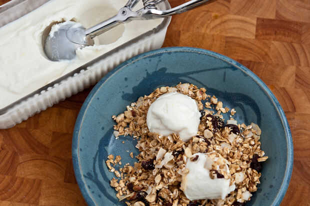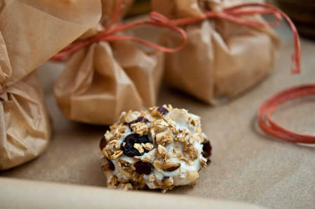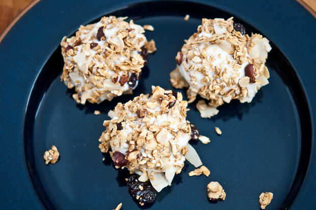 Granola de 2-3 tazas de lugar en un recipiente. Forma el yogur en bolas de 2 pulgadas con una cucharada del helado. Capa con la granola y póngalo en un plato. Coloque la placa de bolas de nieve en el congelador a firme; sobre una media hora debería ser suficiente. Envuelva cada bola de nieve en un cuadrado de papel de pergamino y atar con rafia. Almacene que los paquetes pequeños en una bolsa zip grande en el congelador para una diversión poco tratan en una mañana caliente y húmeda. Mantiene durante 1-2 semanas. Hace cerca de 10 bolas.