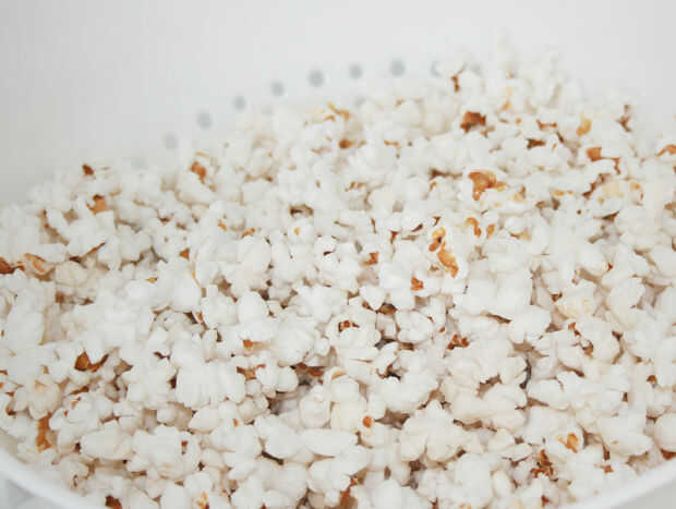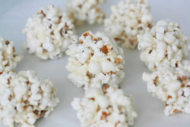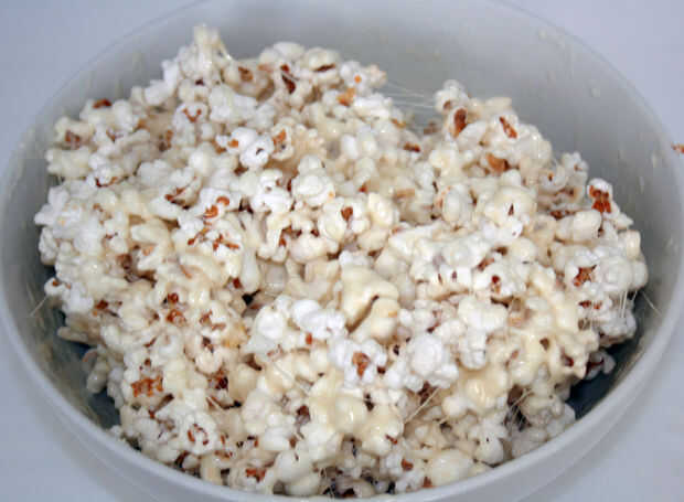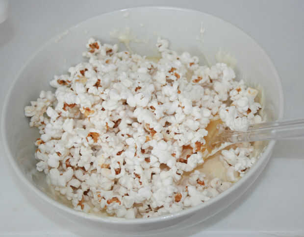 3: doblar las palomitas de maíz en mezcla y forma bolitas (bueno, esto puede tomar unos minutos extras, pero es divertido loco, así que a quién le importa!) Tengo veinte dos 2" bolas de esto. * tip: engrasar sus manos bien antes de formar bolas de palomitas de maíz y asegúrese de obtener entre los dedos!