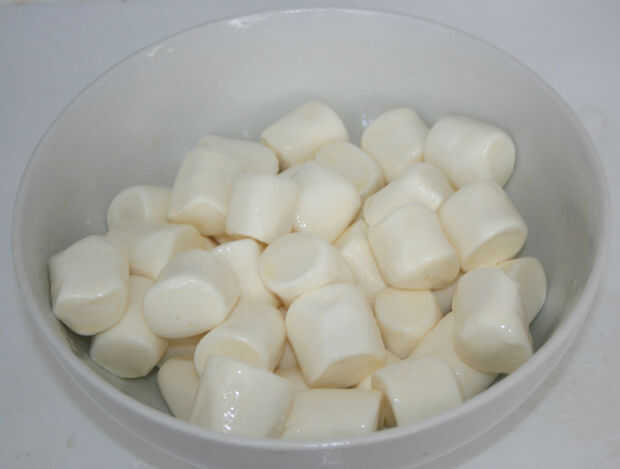 2: derretir la mantequilla en un bol en el microondas (me llevó unos 50 segundos). Agregar malvaviscos y microondas por dos minutos, revolviendo después de uno. (tres minutos!)