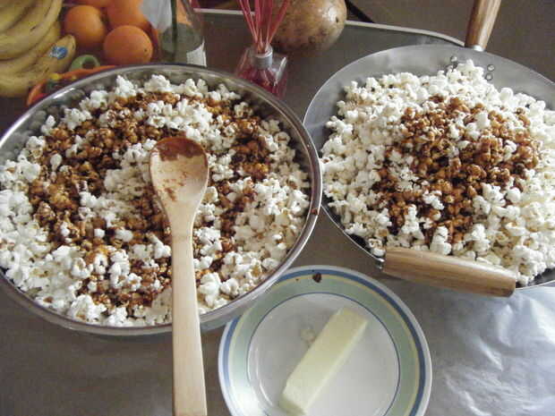 13. Vierta aproximadamente 1/2 de su lote de melaza sobre las palomitas de maíz.