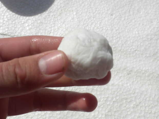 Apriete ligeramente la bola. El agua de la bola moje el papel higiénico seco alrededor de la bola.