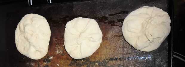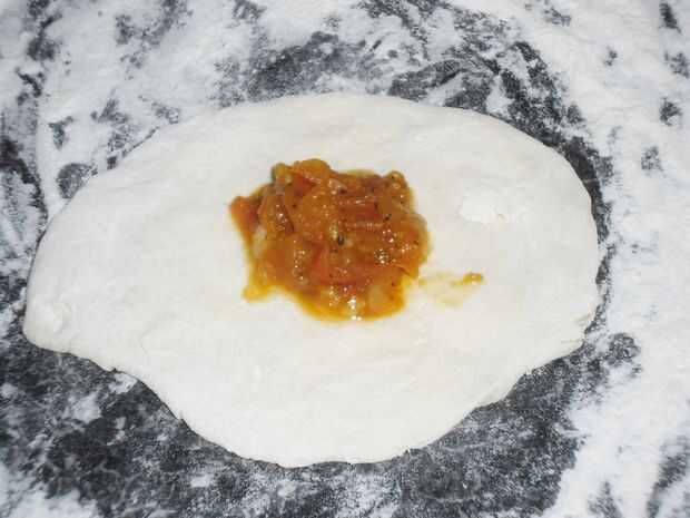 Estirar cada bola hacia fuera en un círculo áspero. Poner 1/8 de la salsa en el centro de cada círculo. Únete a los bordes del círculo en la parte superior en un paquete.