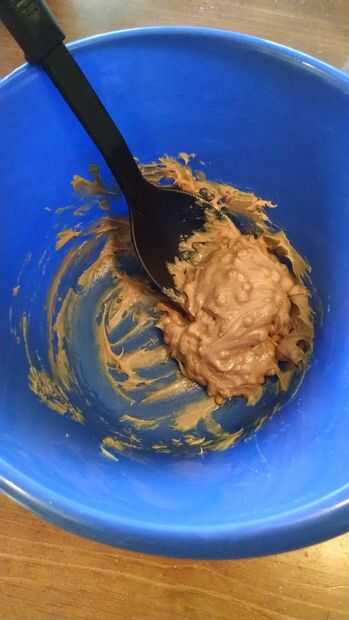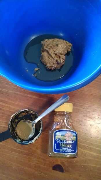 En la mezcla de contenedor vacío en 1/2 taza mantequilla de cacahuete cremosa y ⅓ taza de miel. Mezclar bien hasta que esté cremosa.