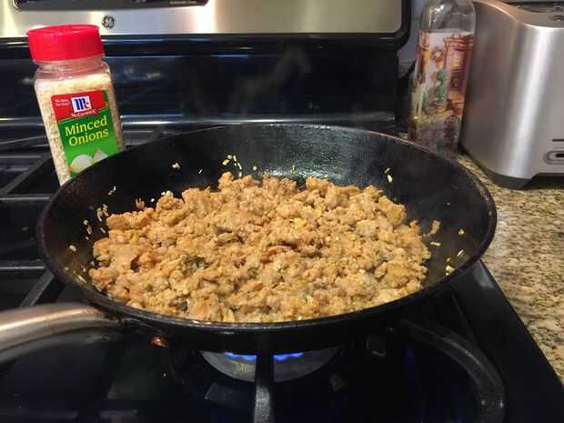 En una sartén grande sobre fuego medio agregar la salchicha. Cocine, revolviendo de vez en cuando, al romper el chorizo a trozos pequeños, cocinar hasta que estén dorados. Los últimos minutos de cocción añadir la cebolla picada, mezclar bien.