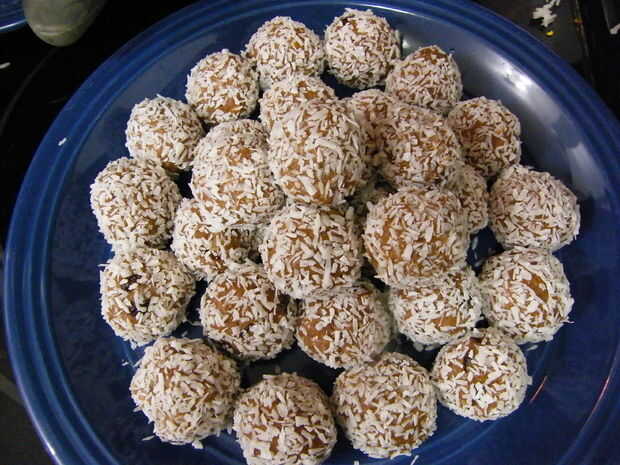 bolas de ron de cocoSTEVIA EN EL CRUDO | TIEMPO DE PREPARACIÓN: 30 MINS | HACE 24 BOLASIngredientes3/4 taza picado higos turcos3/4 taza migas de cookie oblea vainilla (aproximadamente 12 galletas finamente rompieron)3/4 taza de nueces, tierra3/4 de t