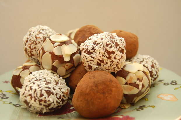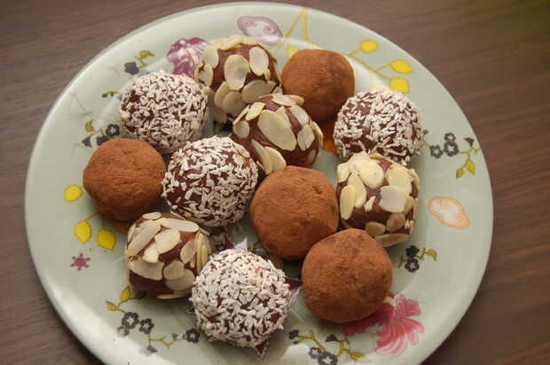 Esta receta pretende usar cualquier pastel de chocolate regular, sin embargo he utilizado mi izquierda sobre cupcakes chocolate caramelos salados y algunos de la versión relleno cereza. Como consecuencia de ello no necesitaba cualquier mermelada adicional, sólo de bombardeando la izquierda sobre cupcakes que terminó con una goma bastante gloopy, especialmente después de que añadí el ron. Para espesarlo hasta un poco añadí en un par de puñados de avena arrollada y blitzed un poco demasiado. Esto fue inspirado por el sueco chokladboll. Puede que necesite ajustar las cantidades dependiendo de la humedad de la torta que está utilizando. Lo más importante es que logres la consistencia adecuada de una pasta espesa.