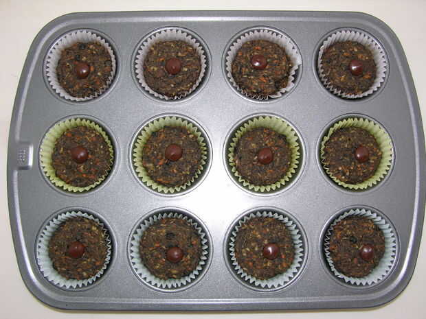 Añadir un chip chocolate oscuro a cada forros de papel encima de la masa (opcional).
