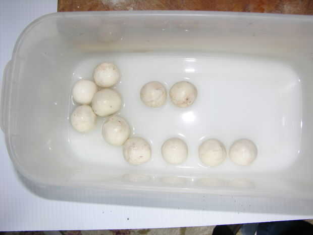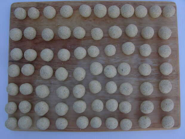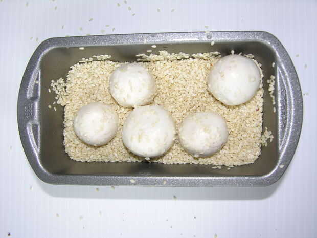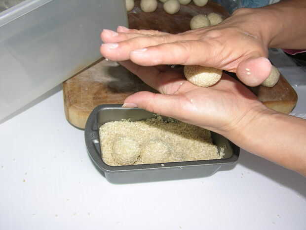 Colocar las bolas en un recipiente estrecho que tiene una cama de semillas de sésamo profundo en él (yo usé un molde de pan). (Semillas de sésamo ir rancias fácilmente una vez mojado. El propósito de usar un recipiente estrecho es utilizar semillas de sésamo tan poco como sea posible tener tan profundo una cama como sea posible, para no acabar tirando hacia fuera el restos húmedo sésamo semillas.), rodarlos todo en semillas de sésamo.