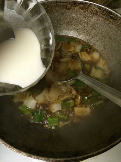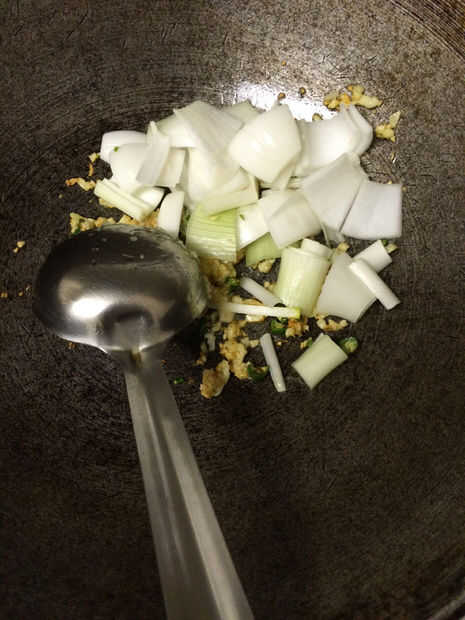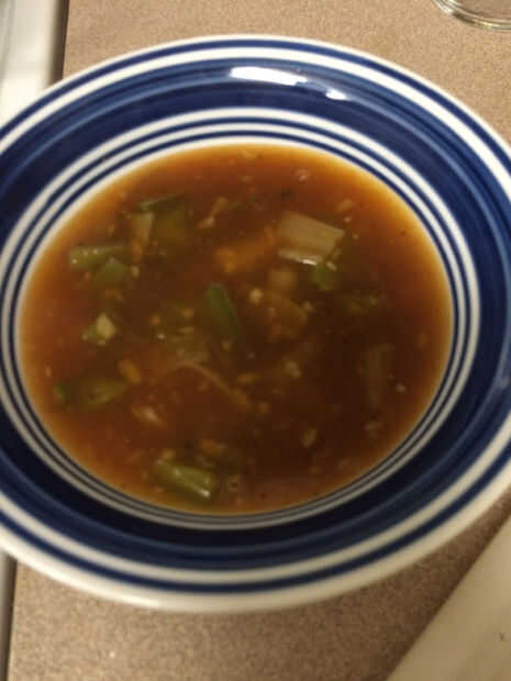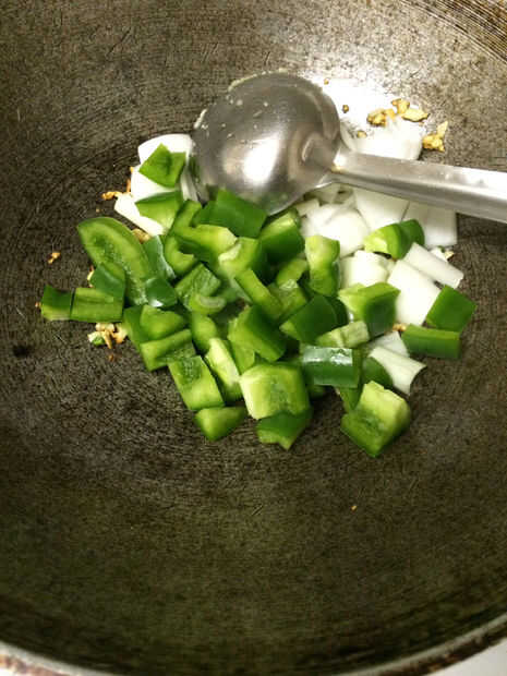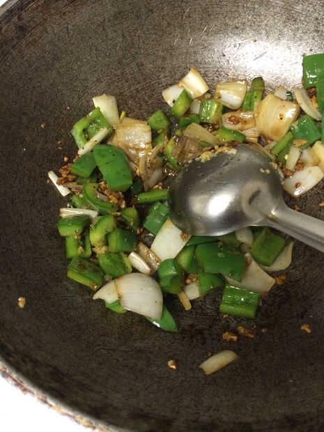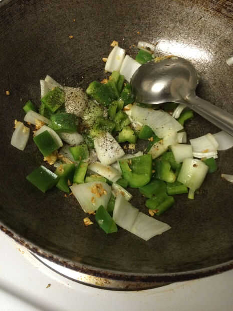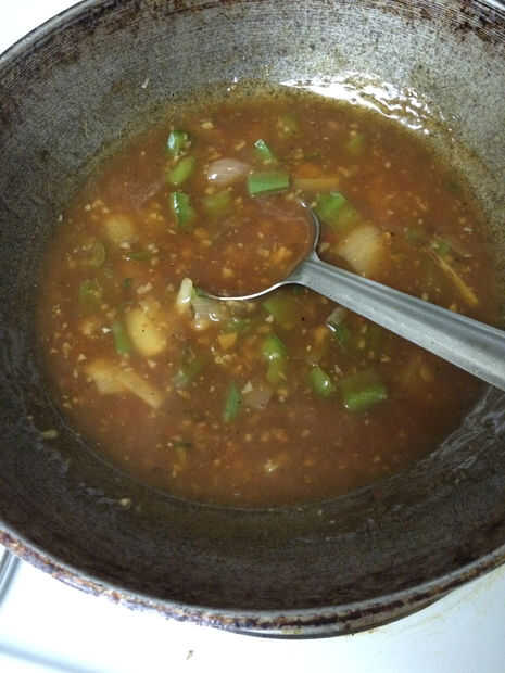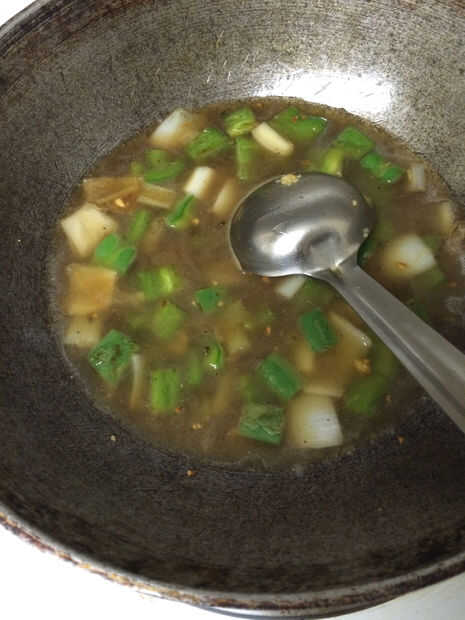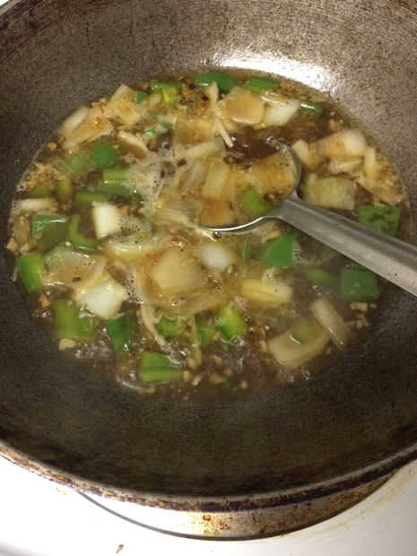 • En un sartén amplia caliente el aceite, añadir ajo, Chile picado, cebolla verde, pimiento verde, sal, pimienta negra, salsa de soja, agua y dejar a la ebullición