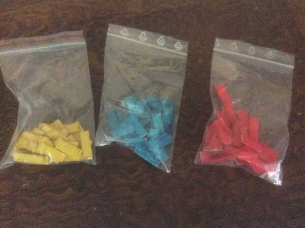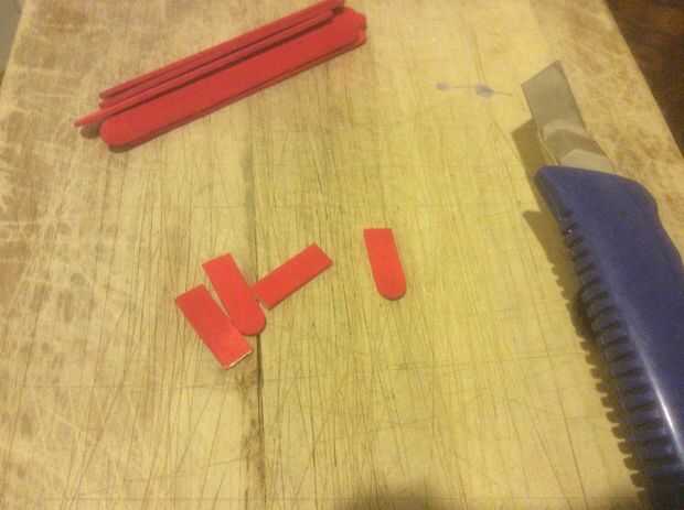 Para el juego, he usado colores que palillos del popsicle como marcadores. He encontrado que puede utilizar un cuchillo para marcar una línea a cada lado y luego presione hasta que quede muy limpio. Es una manera rápida y eficaz para hacerlos. Cortar a la mitad y luego la mitad otra vez. Yo soy clasificarlos en bolsas zip pequeño, pero también puede utilizar cajas de fósforos. Palitos de colores están disponibles en tiendas de arte o tiendas de $2. También podrían hacerlos de modelado de arcilla, sugru o arcillas de tipo fimo. Eres un manojo de creativo, 3D imprimir algunos si quieres. Estoy seguro que alguien puede hacer de PVC o plástico reciclado. Sólo tiene dos colores y rápido de 40 marcadores de cada uno, por lo que parecía. El tamaño es el tamaño de los marcadores de la carretera en el tablero.