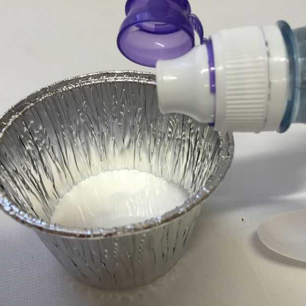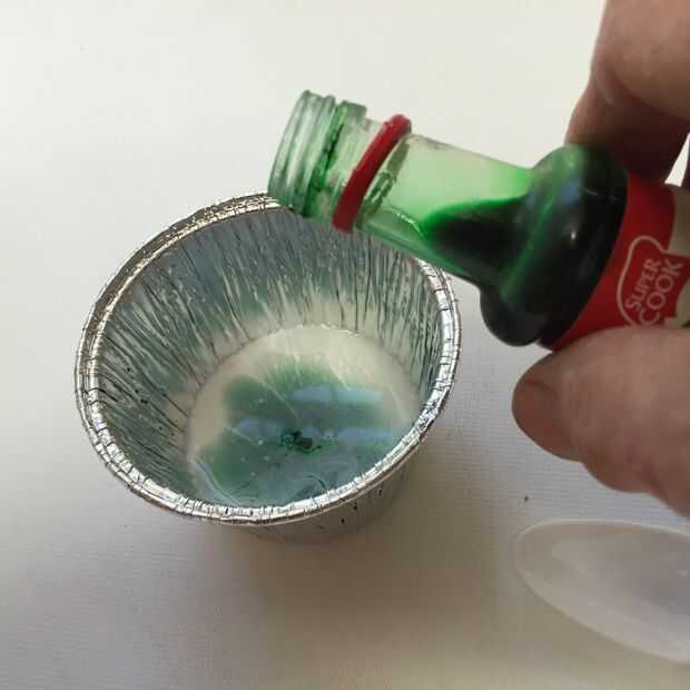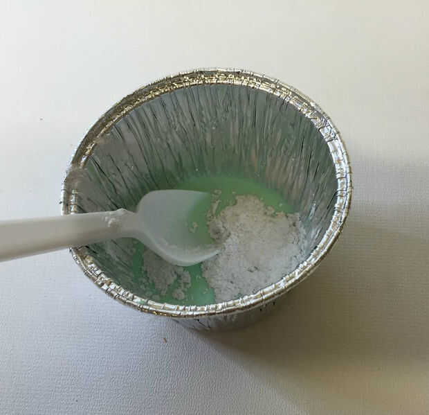 Poner alrededor de 15 ml (1 cucharada) pegamento PVA en el contenedor y agregar una misma calidad de agua y unas gotas de colorante de alimentos. Mezclar con la cuchara de plástico. Agregar sobre una cucharadita de polvo de talco y revolver.