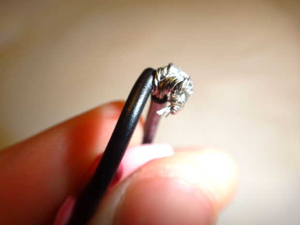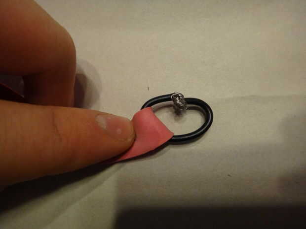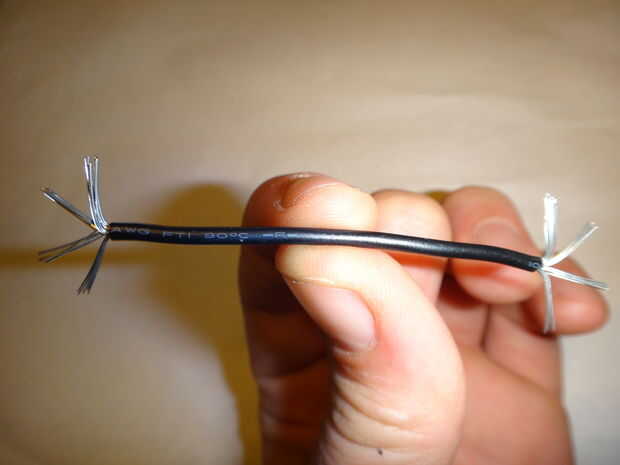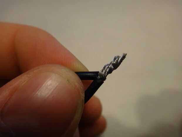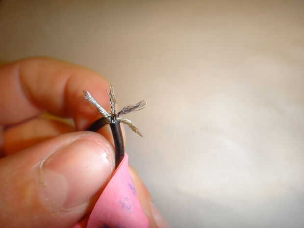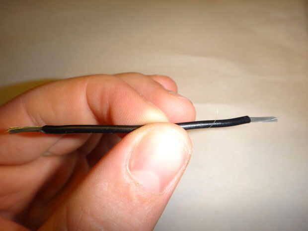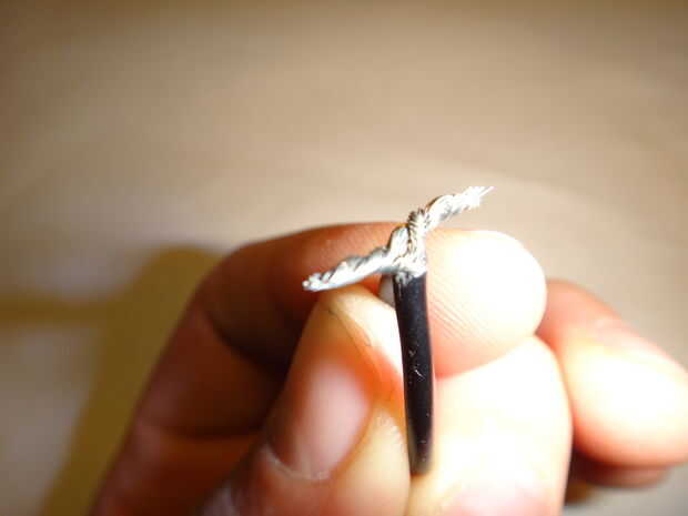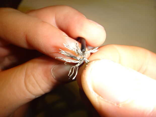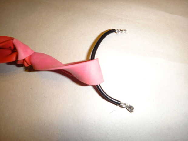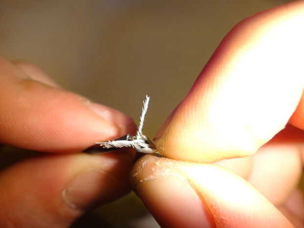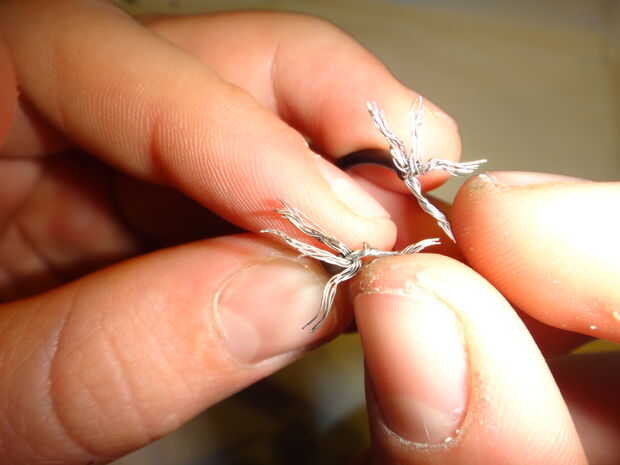 Este cable se hará en forma de bucle para atar la catapulta al cohete. Tiene mucho tirón actuando en él, por lo que la articulación en el bucle debe ser fuerte. Para hacerlo, tira alrededor de la mitad de una pulgada y un cm de cada extremo del cable con las tijeras, puesto por un extremo de la cadena de goma, los filamentos se dividen en cuatro grupos en cada extremo (mina estoy haciendo sin que sea de la cadena de goma para las gomas no se en el camino de las imágenes. No lo hace. Es inutil si no está acoplada a la cadena). Coinciden con los extremos hacia arriba (Fig. 6) y tuerza los ocho grupos en pares (Fig. 7), un grupo de cada par de cada extremo. Esto le dará cuatro grandes grupos (Fig. 8). Trence estas en pares (Fig. 9), para darle a paquetes (Fig. 10). Tuerza los dos paquetes y doblar los cables trenzados (Fig. 11), como en foto. 12, por lo que usted mismo no pinchar sobre ellos. Doble el lazo de modo que es un óvalo con la articulación de un lado (Fig. 13).