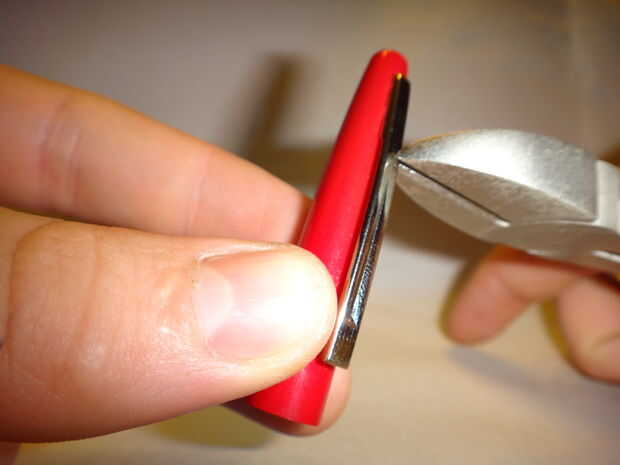 Tomar los cortadores laterales y cortar la mayoría del clip de bolsillo en el extremo superior de la pluma (estudio Fig. 2 por cuanto para tomar). A continuación, utilice el cuchillo x-acto para afeitar lejos un poco del plástico debajo del clip (vea Fig. 4 ubicación y cuánto para tomar). Eso es todo para el gancho de la catapulta.