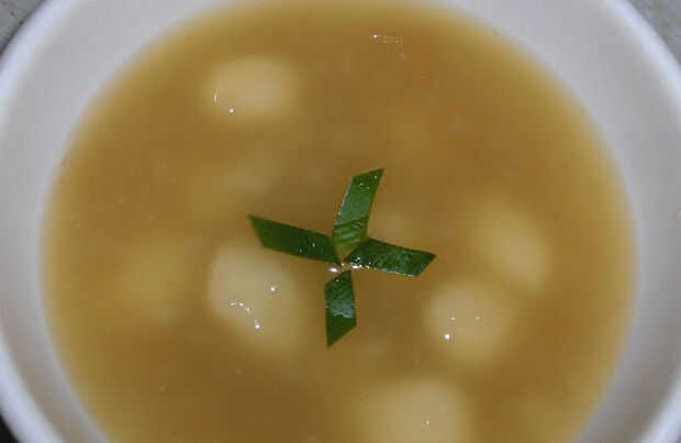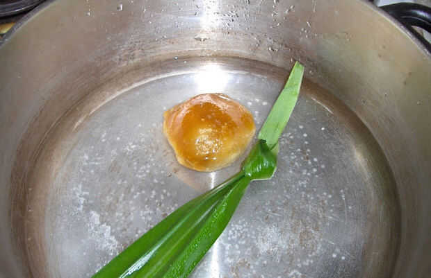 Poner a hervir 400 ml de agua y luego agregar sal, azúcar de Palma y screwpine hojas atan en el nudo. Cocinar hasta que se disuelva el azúcar.