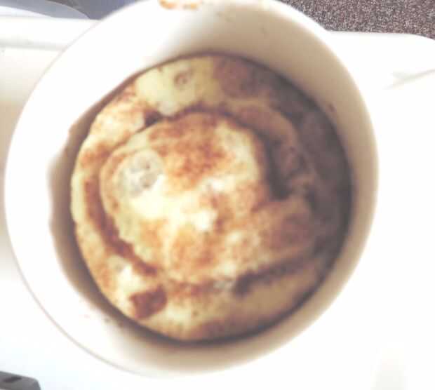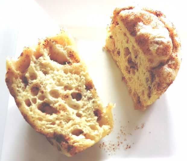 Luego bajé un bollo de canela del paquete en la taza encima de la salsa.