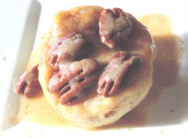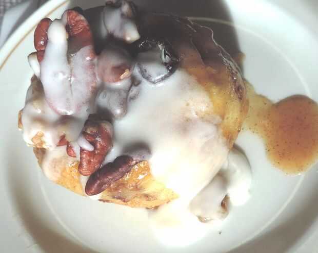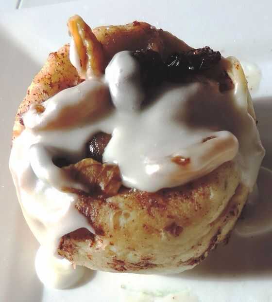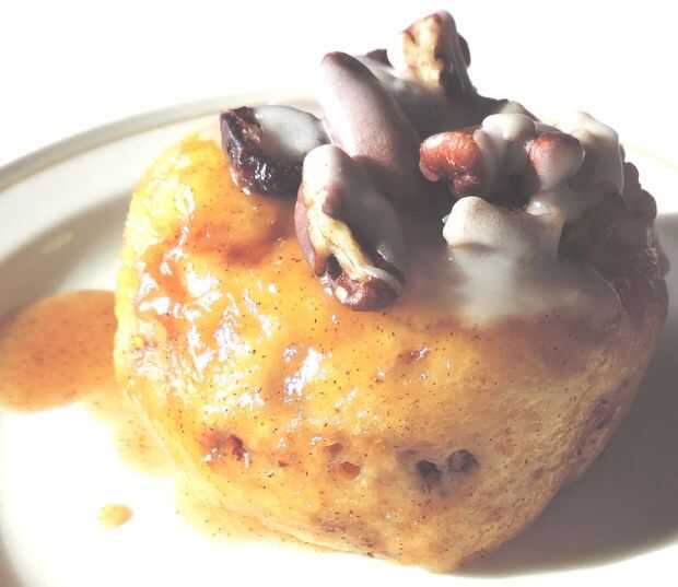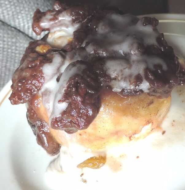 Nueces, pasas, salsa de caramelo y glaseado blanco