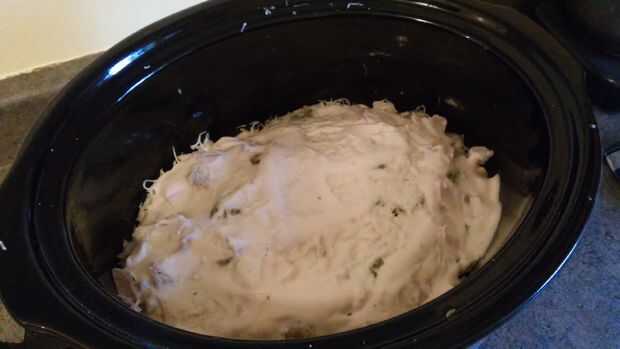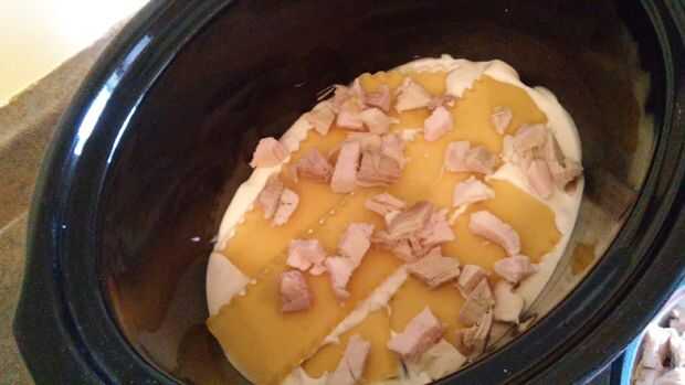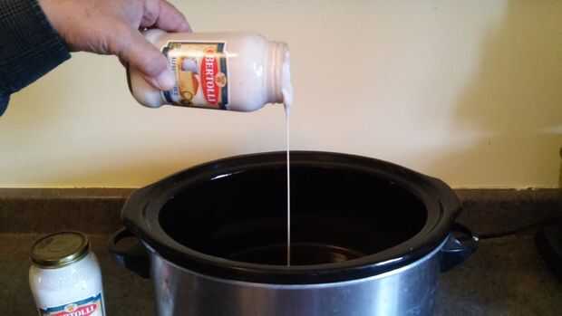Gire a la olla baja. Vierta 1/2 frasco de salsa Alfredo en el fondo de la olla.