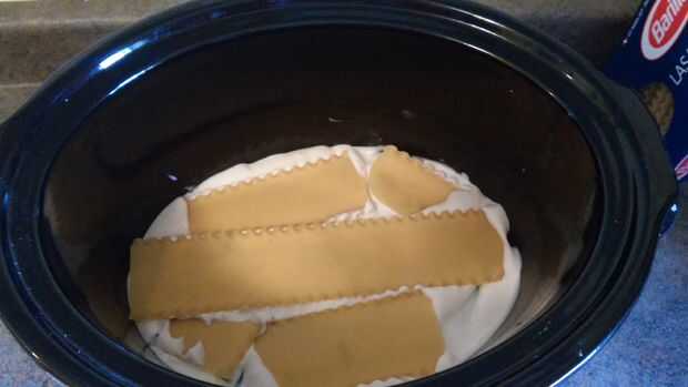 Lugar una capa de lasaña sin cocer los tallarines en salsa.