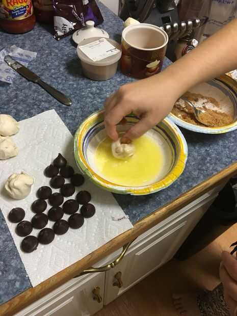Rodillo de la bola de"bondad" en la mantequilla fundida para cubrir. Esto será lo que llevará a cabo la canela y el azúcar sobre la bola.