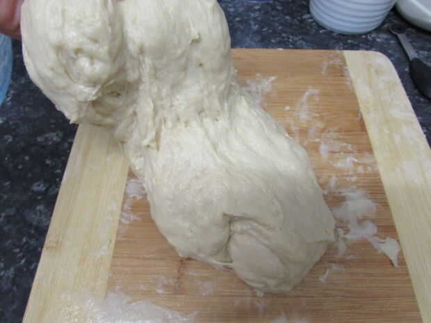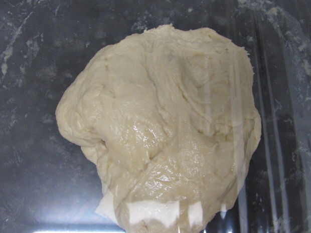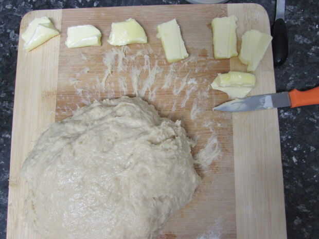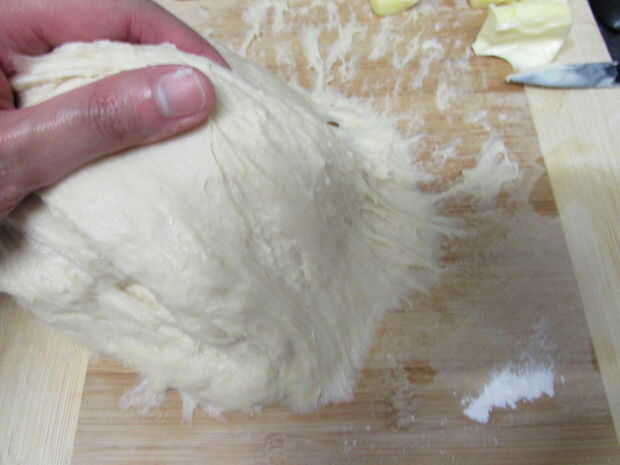 Después de 10 minutos de amasado, corte la mantequilla sin sal a pedazos. Incorporar la mantequilla uno a la vez amasando la masa. Después se amasa la mantequilla en, se nota que la masa no se pegue a la superficie y es bastante brillante (cuadro 6). Vuelva a colocar la masa en un tazón ligeramente engrasado y cubrir con una toalla de cocina y abrigo de aferrarse. Dejar leudar 1 hora.