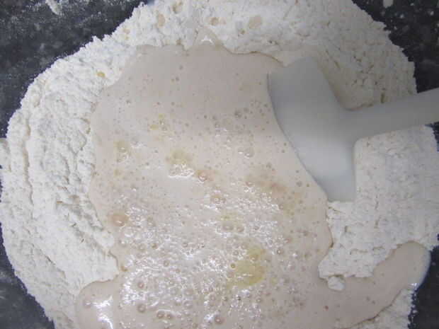 En primer lugar, necesita la prueba de la levadura, mezclando con agua tibia y una cucharadita de azúcar. Cubra el tazón con un paño de cocina durante 15 minutos.