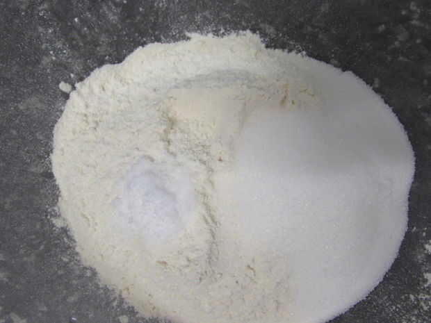 Mientras tanto, usted puede preparar los ingredientes secos. En un bol grande, colocar la harina, azúcar y sal (cuadro 2). Mezclar los ingredientes secos con una espátula. Compruebe su levadura si es espumoso o espuma (cuadro 1). Si es así, entonces añadir a los ingredientes secos con el huevo batido. Mezcla bien con una espátula hasta que se forme la masa. Transferir a una superficie plana y amasa durante 10 minutos. No necesita que la superficie de la harina o añadir harina a la masa. Está destinado a ser amasado pegajoso como se muestra en el cuadro 4.