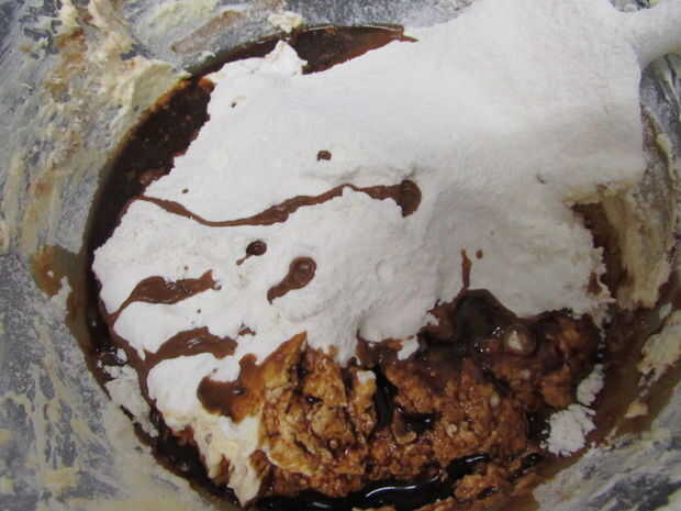 Colocar la harina de repostería tamizada en la mezcla de mantequilla y doblar. Luego agregar el café y doble hasta que la mezcla está bien combinada (última foto).