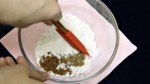 Combinar los ingredientes secos (crepe mix, especia de la calabaza y azúcar morena) en un recipiente.