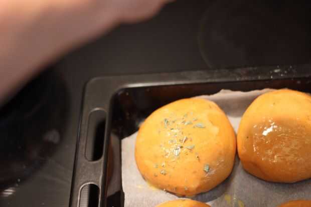 Batir el huevo y utilizar un cepillo para difundir un poco más en la superficie de sus bollos. Ahora usted puede agregar algunos sésamo, hierbas frescas, queso parmesano, tocino, nada te gusta...