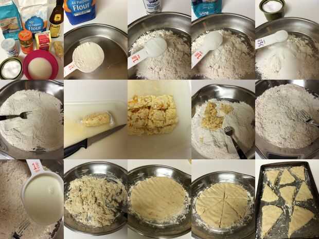 • Colocar la harina, polvo de hornear, sal y azúcar en un bol. Mezcla con tenedor