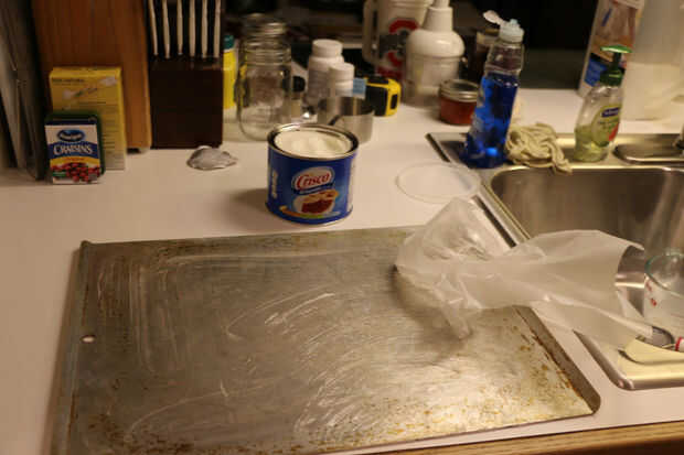 Tome un segundo para prepararse una hoja de galleta con una ligera capa de grasa. Me gusta usar manteca vegetal básica.