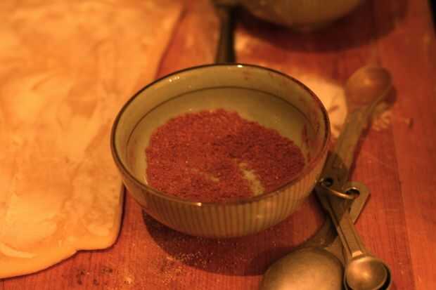 Mezclar las 4 cucharaditas de azúcar y 4 cucharaditas de canela en un tazón pequeño. Esto Espolvoree uniformemente a través de dos piezas de masa.
