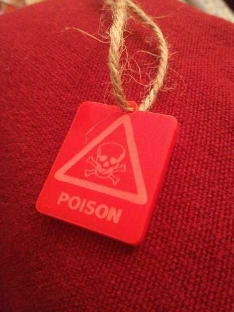 utilicé un cortador láser para grabar algunas etiquetas de veneno en los mismos colores que los bolos.