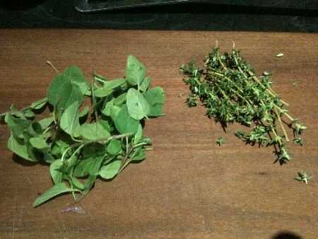 Picar la cebolla y el ajo finamente con un cuchillo bien afilado. Me gusta aplastar el ajo con la parte plana del cuchillo primero a lo de la pulpa y suelte sus aceites encantadoras. Salir todos los ingredientes para un acceso rápido y para que tenga todo lo que necesitas. Escoja el orégano y el tomillo y rasgar para arriba un poco. Retire los tallos leñosos el tomillo.